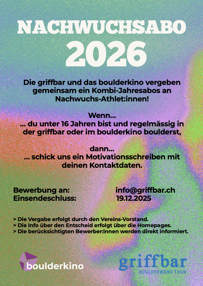 Die griffbar und das boulderkino haben auch dieses Jahr Kombi-Jahresabos an Nachwuchs-Athlet:innen unter 16 Jahren vergeben!